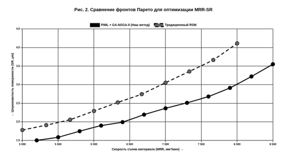 Рис. 2. Сравнение фронтов Парето, полученных с помощью PIML-фреймворка и традиционной RSM. Фронт Парето, сгенерированный нашей системой, явно доминирует над фронтом, полученным с помощью RSM. Это означает, что для любого заданного уровня производительности (MRR) наш метод находит режимы, обеспечивающие на