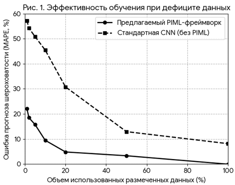 Рис. 1. Зависимость ошибки прогнозирования от объема обучающих данных. График наглядно демонстрирует, что стандартная CNN без физических знаний и аугментации полностью проваливается на малых данных (ошибка >50% при 5% данных), в то время как PIML-фреймворк удерживает ошибку в приемлемых границах (~11%), что делает его пригодным для практического использования.