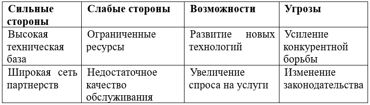 SWOT-анализ показывает, что телекоммуникационная организация обладает высокой технической базой, однако ей необходимо уделить внимание улучшению качества обслуживания и оптимизации ресурсов для успешного реагирования на внешние угрозы.