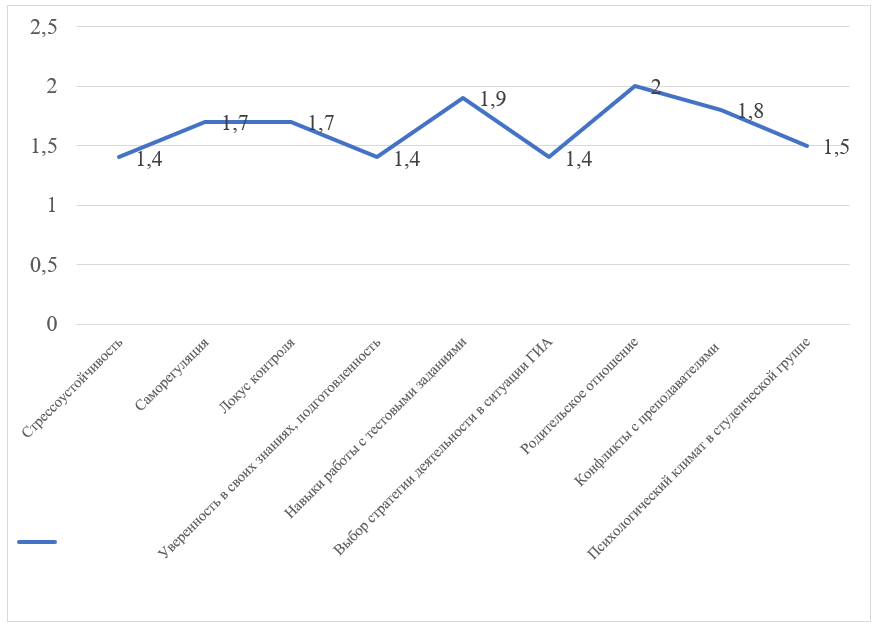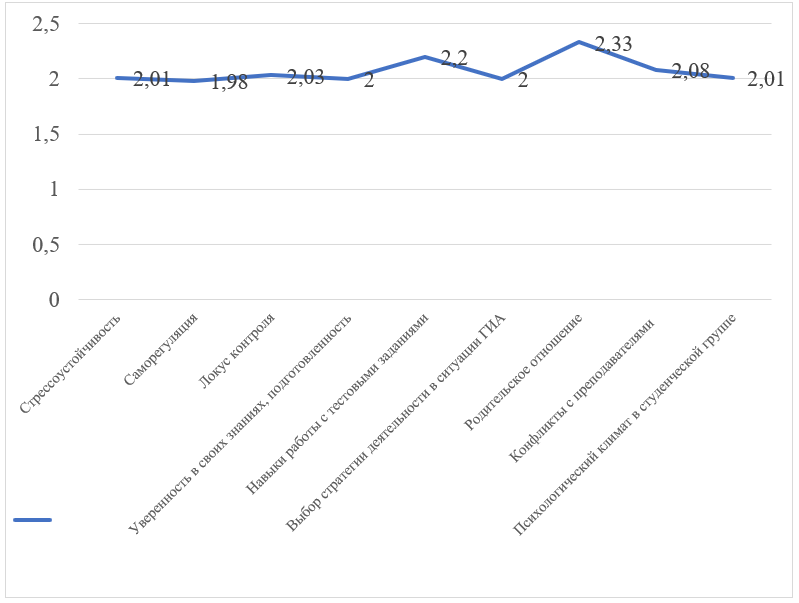 Интересно, что наименее проблемным звеном оказалось родительское отношение (2,33). Это говорит о том, что в большинстве случаев семья выступает не источником давления (как это часто предполагается), а скорее ресурсом эмоционального принятия, что противоречит некоторым литературным данным о завышенных родительских ожиданиях [7], но может быть спецификой данной возрастной группы