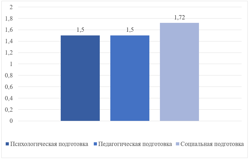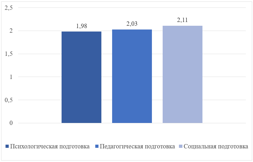 Сравнительный анализ трех направлений подготовки (рис. 2) позволил установить, что наиболее слабым звеном является психологическая готовность (средний балл по группе 1,98), в то время как социальная готовность оказалась несколько выше (2,11). Это подтверждает тезис о том, что внешние социальные ресурсы (поддержка близких) часто сохраняются, тогда как внутренние личностные ресурсы оказываются истощены или недостаточно развиты.