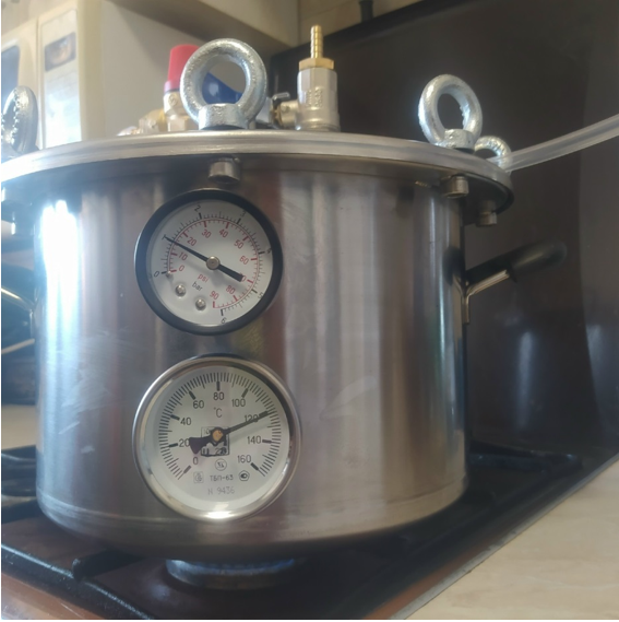 Для наглядности работы данного метода в отношении тетрапаков мы взяли бытовой автоклав на восемь литров с манометорм и термометром, который можно приобрести для бытовых нужд в свободном доступе.