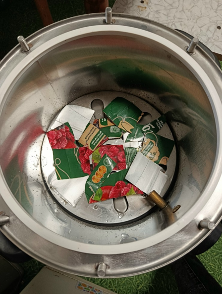 1. До уровня фальшдна автоклава наливаем немного воды (1 литр), в автоклав укладываем показательную порцию нарезанного тетрапака от сока.