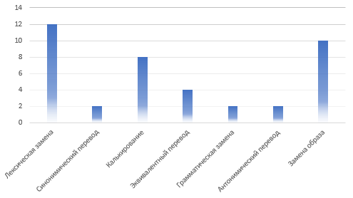 Следует отметить, что при передаче языковой игры в рамках данного исследования использовались лишь некоторые переводческие трансформации, а именно лексические («Карнавальная мощь» — «Carnival might»), грамматические («50 оттенков загорелого» — «50 Shades of Tan Spray»), лексико-грамматические («Нежная королева» — «The No-Snow Queen»). Переводческие трансформации представлены в диаграмме следующими числовыми показателями (см. Диаграмма 2).