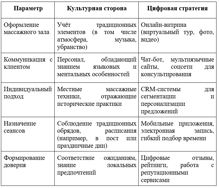 Ниже приводится таблица, где представлены различные формы взаимодействия культурных факторов и цифровых инструментов в сфере массажа (см. Табл. 1).