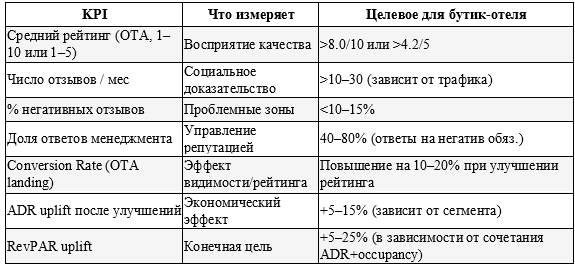 — KPI: средний рейтинг по OTA, число отзывов/мес, % негативных отзывов (<4/10).