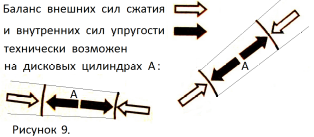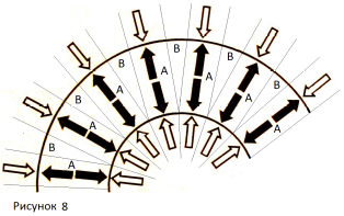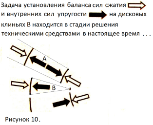 Следовательно, единица массы и объёма внутренней части тороидальной плазмы в процессе сжатия получает большую энергию от сжимающего магнитного поля, становится более энергоёмкой, чем единица массы и объёма внешней части тороидальной плазмы. Это является фактором нестабильности сжимаемой плазмы в тороидальной камере. Возникают колебания в плазменном шнуре и отклонения его от окружности. Представим процесс сжатия как встречное движение фронтов, набирающих кинетическую энергию в период сжатия: внешний, больший по объёму и массе, менее энергоёмкий, энергетически “рыхлый” фронт, встречается в узком шнуре с более энергоёмким внутренним фронтом, который разрывает “рыхлый” внешний фронт. Дисковые клинья В (рисунки 5, 8, 10) способствуют соскальзыванию со средней окружности какого-либо фрагмента АВА…ВА шнура плазмы. Следовательно, разрушение тороидального плазменного шнура в установках типа “токамак” закономерно.