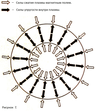 Энергоёмкой экспериментальной установкой является токамак. [8, 9, 10, c. 502-507]. Токама́к – тороидальная вакуумная установка для магнитного удержания плазмы с целью достижения условий, необходимых для протекания управляемого термоядерного синтеза. Плазма в токамаке сжимается и удерживается специально создаваемым комбинированным магнитным полем – тороидальным внешним и полоидальным полем тока, протекающего по плазменному шнуру на средней окружности тора. Сечение тора в плоскости, проходящей через центр тора перпендикулярно его оси – это кольцо. На рисунках 7, 8, 9, 10 контурными стрелками обозначены силы сжатия плазмы магнитным полем. Чёрными стрелками обозначены силы упругости внутри сжимаемой плазмы. Радиальная расходимость тора – причина разной "густоты" стрелок на внутренней и внешней окружностях кольца. Рассмотрим распределение плотностей по объёму тора. Жидкости, газы, пары веществ, плазма (как ионизированный газ) стремятся заполнить занимаемый объём с равномерной объёмной плотностью массы. Следовательно, перед сжатием во внешней части тора имеется большая масса плазмы, чем во внутренней части тора. Магнитная система создаёт неравномерное магнитное поле из-за геометрической радиальной расходимости тора. На внутреннюю часть плазмы в торе действуют с большей плотностью силы магнитных полей при меньшей массе и объёме плазмы (рис. 7, 8), чем на внешнюю часть плазмы в торе при большей массе и объёме плазмы.