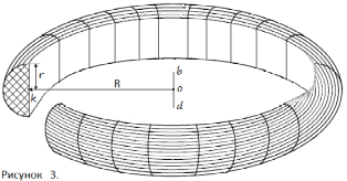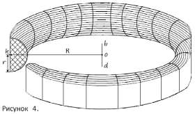 Представим сечение тора средним цилиндром радиуса R, ось которого совпадает с осью тора b – d. Результат сечения – внешняя, большая часть тора (рисунок 3) и внутренняя, меньшая часть тора (рисунок 4).
