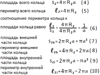 Приведенные формулы показывают: периметр всего плоского кольца равен двум длинам средней окружности кольца (5); при равной площади кольцо имеет большую длину периметра, чем круг; при увеличении ширины кольца увеличивается его площадь на единицу длины периметра; при уменьшении ширины кольца уменьшается площадь на единицу длины периметра (6). Радиальная расходимость – геометрическое свойство плоского кольца: внешняя часть кольца за средней окружностью имеет большую площадь и периметр, чем внутренняя часть кольца (7, 8, 9, 10).