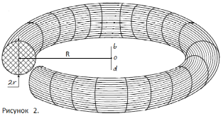 Тор, или “бублик” – геометрическая фигура вращения радиусом R вокруг центра тора о (на оси b – d) центра k образующей окружности радиуса r; объём с внутренним промежутком [3, c. 48, с. 102], рисунки 2, 3, 4. Центр тяжести тора расположен в геометрическом центре тора - точке о, вне объёма тора.
